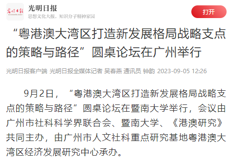 9月2日,“粤港澳大湾区打造新发展格局战略支点的策略与路径”圆桌论坛在beat365英国官方网站举行,会议由广州市社科科学界联合会、beat365英国官方网站、《港澳研究》共同主办,由广州市人文社科重点研究基地粤港澳大湾区经济发展研究中心承办。