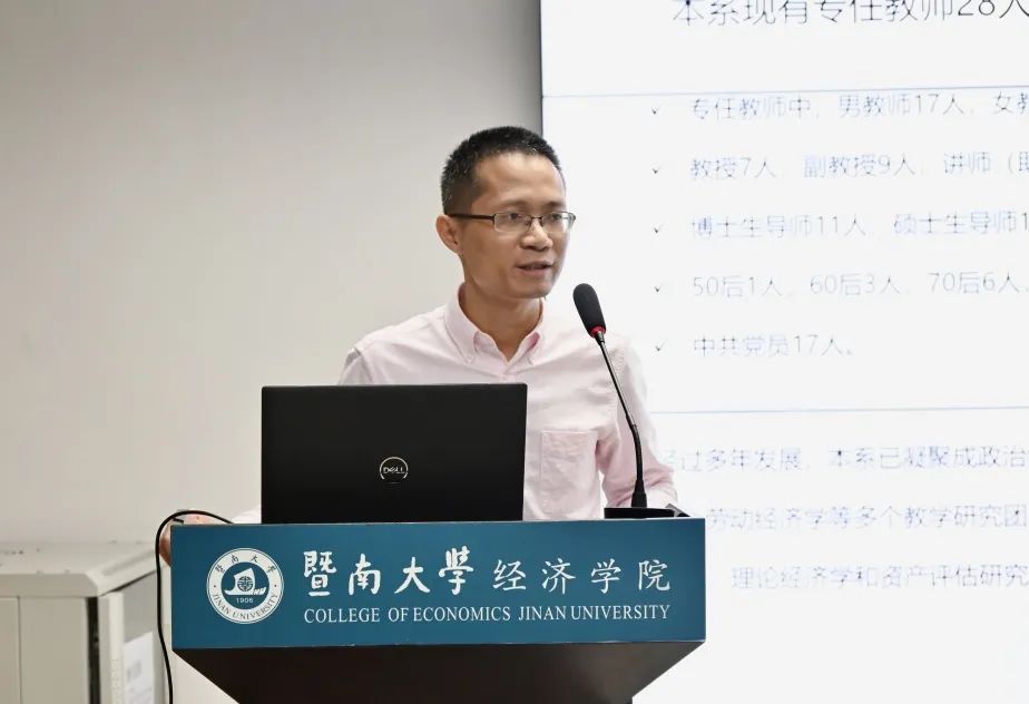 经济学系主任王贤彬介绍了专业建设与本科生培养、学科建设与研究生培养、科学研究与社会服务等工作,并围绕经济学系当前存在的问题以及下一步工作思路作了总体汇报。他表示未来要做好各层次人才的培养,补齐理论经济学学科短板,努力实现高水平学术成果突破,推动建设高级别研究平台,针对性培育高层次教师人才队伍。