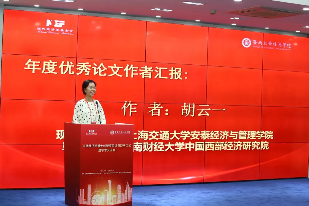 毕业于上海交通大学安泰经济与管理学院的胡云一博士作为获奖代表上台发言。胡云一博士代表各位优秀的同辈们向当代经济学基金会致以感谢,并感谢学术界各位前辈们的认可以及鼓励和博士导师的悉心指导。同时分享了自己对中国经济挑战和结构转型的认识,希望同广大青年学者一起,致力于讲好中国故事,回答中国问题,为经济学科的发展,为中国经济的发展贡献力量。