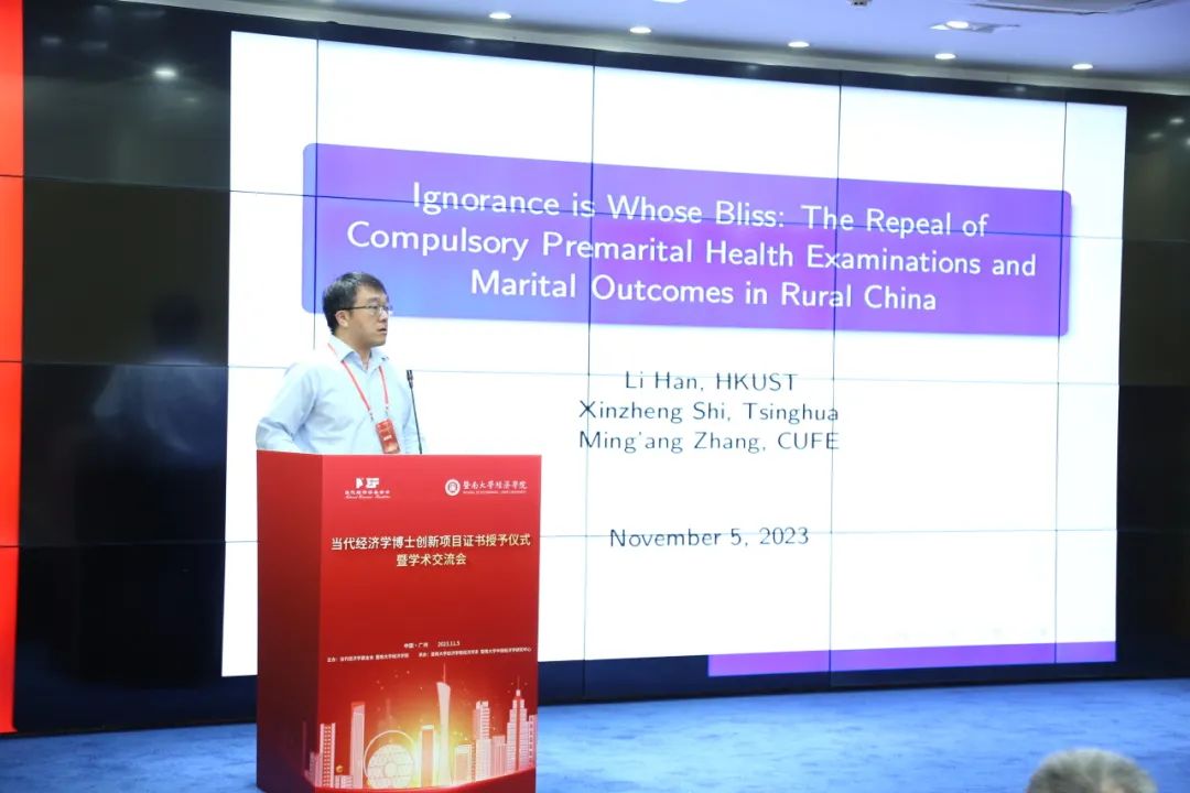 施新政副教授以“无知谁之福:强制婚前体检的废除对中国农村婚姻的影响”为题进行主旨演讲,全过程展现了如何以规范的经济学研究方法讲好中国故事,启示青年经济学研究者对基本事实和重要问题的关注,进行严谨的理论和实证分析,向世界真实、立体、全面地展示中国经济社会发展面貌。