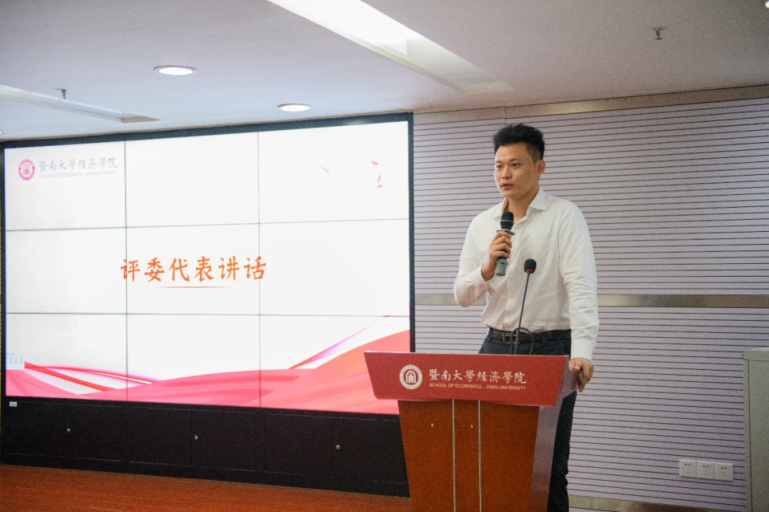 评委代表洪杰鹏讲话。他提醒同学们职场存在众多的不确定性,必须提前做好准备适应职场,明确职业目标、放平心态,找准方向再前进。他还建议同学们,好好思考和了解意向岗位的要求,有针对性地提高个人素质。