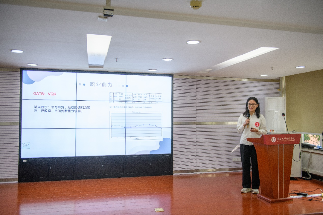 随后,大学生职业生涯规划大赛正式开始。首先是成长赛道的7名选手进行生涯发展展示,着重介绍自身职业发展规划,以及为实现职业目标做出的具体行动和成果。选手们通过MBTI性格测试、就业力测试结果等展示个人的职业发展方向和就业能力。评委老师们结合选手的现场表现,进行提问和评分,并提出建议。