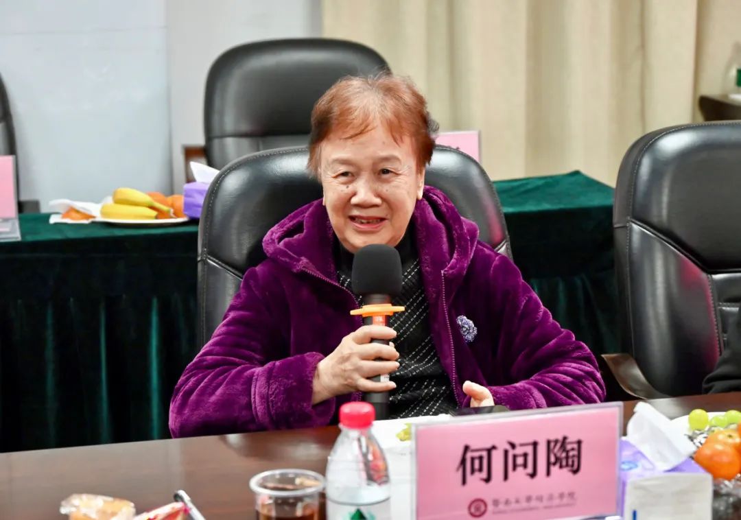 何问陶老师表达了对63级政经同学能够多次团聚的羡慕之情,并希望校友们珍惜欢聚的时光与来之不易的聚会。她表示,“作为同龄人,我十分羡慕你们的同学情、师生情、校友情。毕业后来到经院任教,40多年来我已将自己完全融入了暨南,也希望能够融入你们,成为你们当中的一员!”