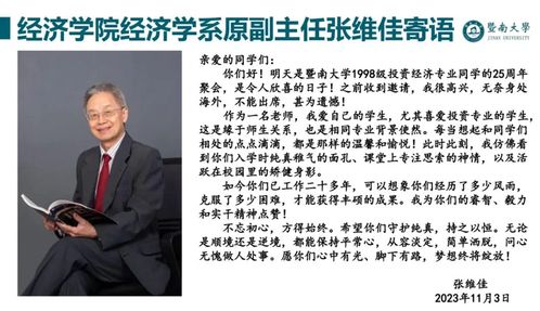经济学系原副主任张维佳老师也向校友们发来了大洋彼岸的问候,鼓励大家不忘初心,持之以恒,不论遇到什么困难都能从容淡定、简单洒脱,最后愿同学们心中有光、脚下有路,梦想终将绽放!