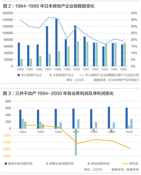 1985年《广场协议》签订后,为扩大内需,日本银行在1986-1987年连续五次降息,热钱大量流入股票市场和房地产市场,中小房地产企业数量剧增,并借助房价大涨之势大幅发展销售业务,利用借债便利疯狂加杠杆实现快速扩张。而相比于中小房地产企业高比例的销售业务,以三井不动产为代表的大型房地产企业多元化发展策略显得更加理性,且在发展租赁业务带来的重资产特征约束下,公司资产周转相对较慢,扩张速度较中小房地产企业低(见图2)。