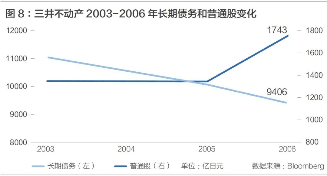 2003年,三井不动产在提出的“Challenge 2008”计划中,继续为有息负债和债务股本比率制定量化目标:有息负债低于9900亿元,债务股本比率降至1.2,即在资产规模缩减8%的情况下,有息负债缩减30%。为达成降负债的目标,三井不动产在2005-2006年将可转债转换成股票,长期负债持续下降,普通股上升(见图8)。