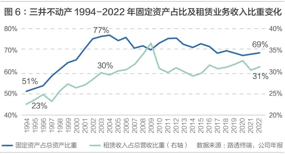 “十年寒冬”的教训让三井不动产意识到原有“高杠杆”经营模式的不稳定性,于是公司在2003年明确提出要进行业务模式转型,降低杠杆率。一方面,三井不动产加强租赁业务的发展;另一方面,发展管理业务作为公司新的利润增长点。三井不动产提出该转型方向的原因主要有:租赁业务带来的重资产特征,约束了三井不动产在泡沫时期利用高杠杆非理性扩张,且在泡沫破灭后助其穿越房地产周期;销售业务受到重创,经营受房地产周期影响较大;1997年亚洲金融危机后,日本出台《特殊目的公司实现特定资产流动化法》,给J-REITs的上市提供了法律框架。