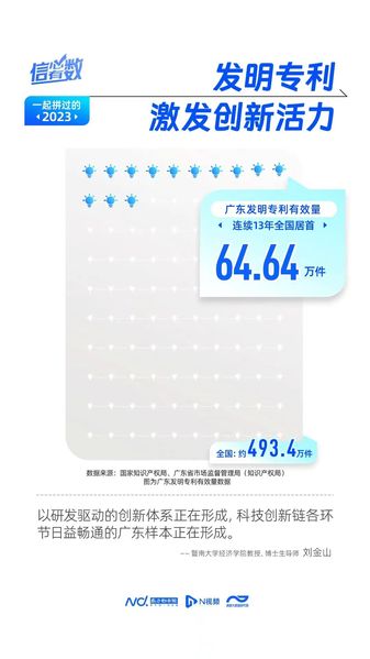 知识产权的高效益运用是创新发展的重要路径。统计数据显示,截至2023年10月底,广东全省累计专利授权量606.10万件,发明专利有效量64.64万件,PCT国际专利申请量27.44万件,以上指标均居全国首位。其中广东发明专利有效量已连续13年全国居首。