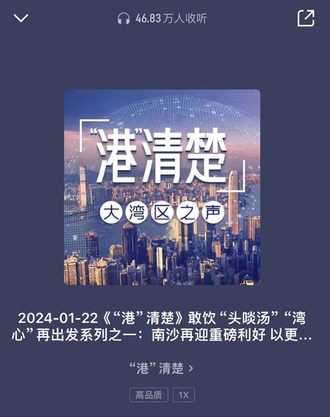 据悉,《“港”清楚》是中央广播电视总台的重点电台节目,节目内容主要涉及三个大类:一是及时解读中央和地方的方针政策,助力大湾区发展建设,二是聚焦大湾区特别是港澳地区热点事件,重点就香港时事话题发表观点,为爱国爱港人士提供发声平台,主动设置议题,积极引导舆论,三是着重关注大湾区建设取得的新成绩、新进展、新经验。「▼点击《“港”清楚》栏目收听本期节目」