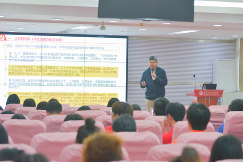 “中华民族的昨天是‘雄关漫道真如铁’,中华民族的今天可谓‘人间正道是沧桑’,中华民族的明天是‘长风破浪会有时’”,夏泉教授引用习近平总书记参观复兴之路阐释“中国梦”时的重要讲话,为同学们生动讲述了如何认识“时与势”。