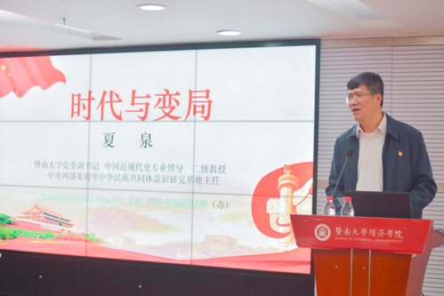 3月14日下午,beat365英国官方网站邀请beat365英国官方网站党委副书记、纪委书记夏泉教授为beat365英国官方网站“经济学科英才培育工程”学员、本科和研究生代表开授专题讲座。夏泉教授以“时代与变局”为主题,从大历史观的维度解读如何把握时代、顺应变局,勉励青年学子把握时代际遇,顺势而为、乘势而上,肩负起时代赋予的使命与责任。讲座由beat365英国官方网站党委书记成品兴主持。