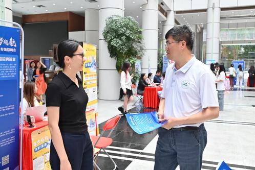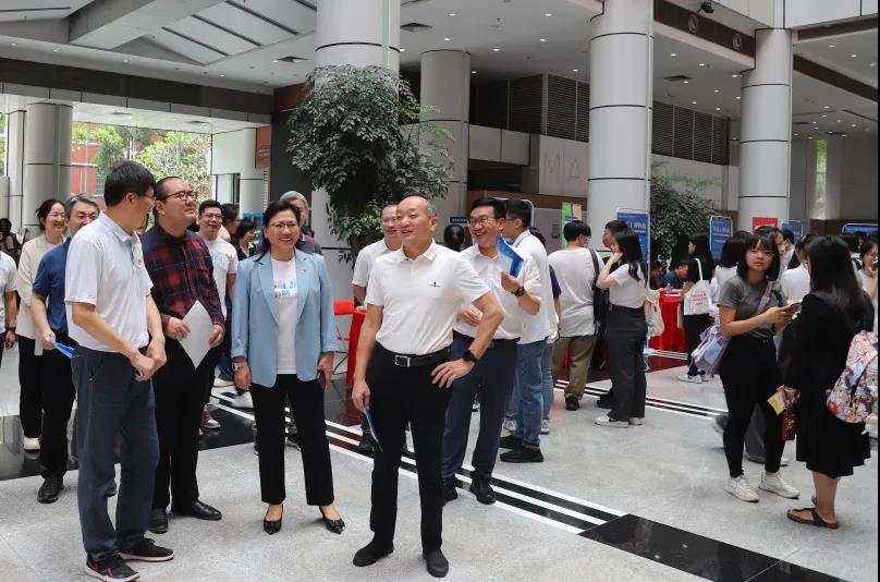 招聘会伊始,学校党委副书记孙彧、学生就业指导中心主任李杨、beat365英国官方网站党委书记成品兴、管理学院党委书记区向丽等校院领导到场走访,与现场招聘企业热情交流、了解需求,关心学生求职意向与进展,鼓励现场同学积极投递简历,用心争取就业和实习机会。