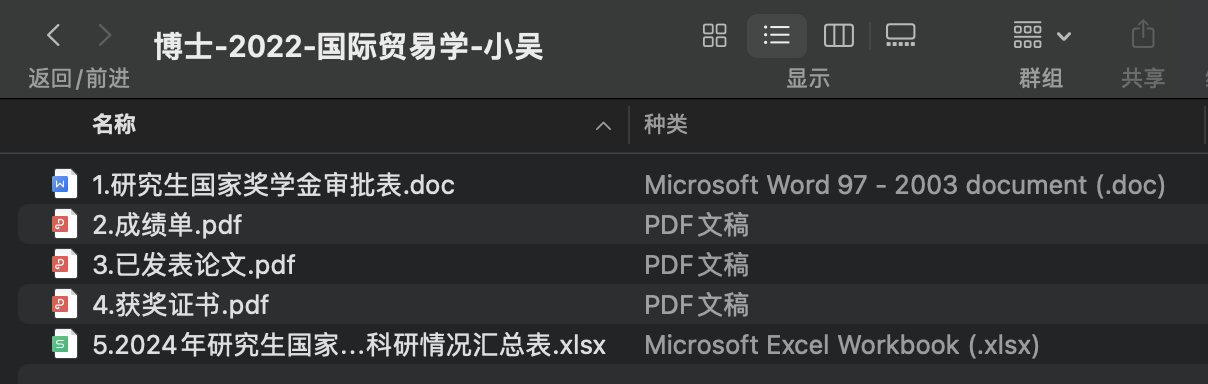 电子版文件名为:培养层次-年级-专业-姓名,相关材料须按序号及格式要求提交。图示如下:以上电子版材料(自备U盘)随纸质版一并提交。