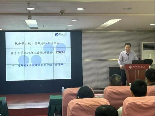 首先,财税系系主任冯海波教授对莅临现场的校外实践导师表示诚挚欢迎,他介绍了各位实践导师的专业背景及其事业成就,感谢他们在学生的社会实践、职业规划、论文写作、行业前沿讲座与相关课程建设方面所提供的宝贵支持和贡献。