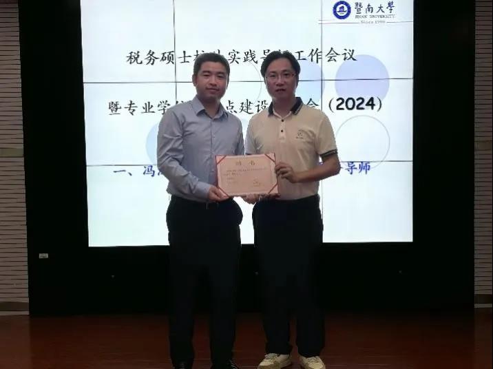 财税系党总支罗勇辉书记向2024年新聘任实践导师、入选财政部高层次“财会人才素质提升工程”的卢鹏老师发放聘书。