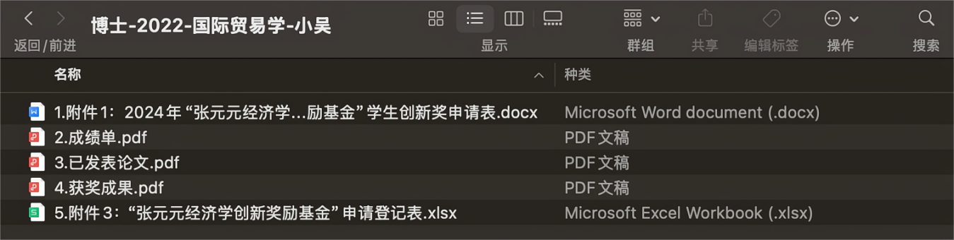 电子版文件名为:培养层次-年级-专业-姓名,相关材料须按序号及格式要求提交。图示如下:以上电子版材料(自备U盘)随纸质版一并提交。