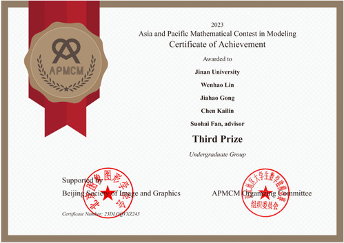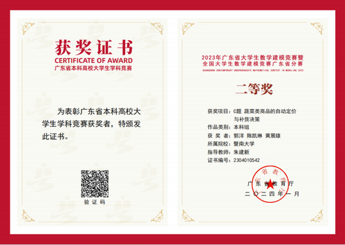 “功不唐捐,玉汝于成”,陈凯琳在2023年全国大学生数学建模竞赛中,凭借出色的模型构建和论文撰写能力,荣获省级二等奖;后在亚太地区大学生数学建模竞赛中获得三等奖,并在美国大学生数学建模竞赛中斩获H奖。