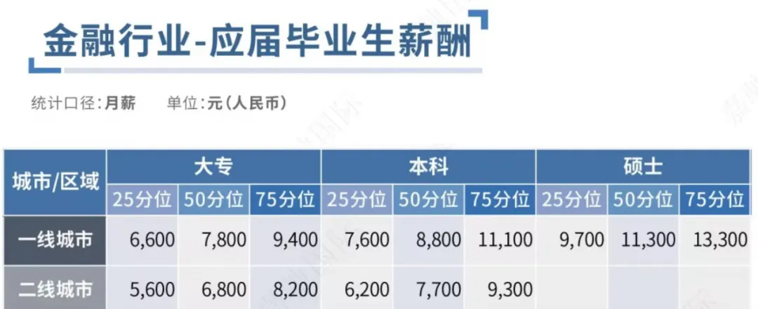 全国金融行业应届生毕业平均薪酬位列Top2,一线城市本科学历平均月薪可达8.5k,硕士可达11k,就业发展前景广阔。其中,由于CFA持证人专业的技能与充实的知识储备,使得其能够获得比一般金融从业者更高的薪酬待遇。