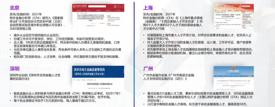 CFA持证人被列为紧缺型金融人才,其认证受到多个地方政府的广泛认可,通过CFA考试意味着求职者有机会选择更好的城市发展。北京、上海、广州、深圳、西安、苏州、宁波、武汉、成都、杭州、南京、天津、厦门等全国20余个省市的地方政府均出台了针对CFA持证人的人才引进政策。