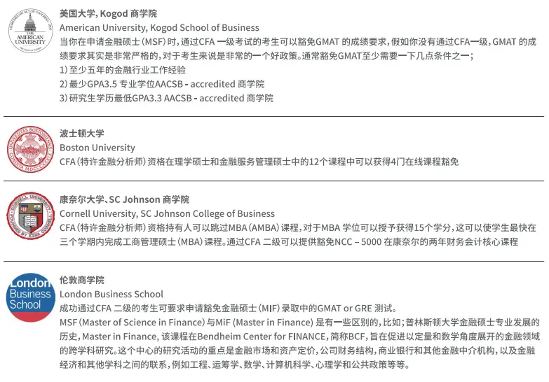 申请国外知名商学院(例如波士顿大学、康奈尔大学、伦敦商学院、多伦多大学等)的留学项目时,阶段性通过CFA考试的学生可申请免考GMAT。此外,部分院校还允许此类学生申请相关课程免修。更多认可CFA资格的全球院校及其课程信息,请查询CFA协会官网。