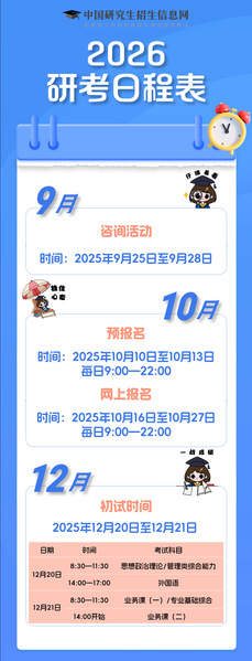 2026年全国硕士研究生招生初试时间为2025年12月20日至21日。网上报名时间为2025年10月16日至10月27日(网上预报名时间为2025年10月10日至10月13日,相关工作安排由各省级教育招生考试机构确定并公布),每日9:00—22:00。网上报名结束后,各省级教育招生考试机构将组织网上确认工作,对考生报名信息进行审核。所有考生均须在规定时间内参加网上报名和网上确认,逾期不再补办。