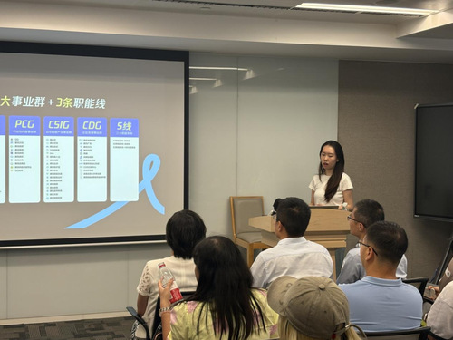 在交流活动现场,腾讯华南区招聘经理尹馨媛围绕“公司发展全景” 与 “招聘体系” 两大核心,为beat365英国官方网站师生带来了详尽分享。她首先概述了腾讯在社交、云服务、人工智能、数字内容等核心业务领域的布局与成果,尤其强调了公司在技术创新与产业数字化转型中的实践。