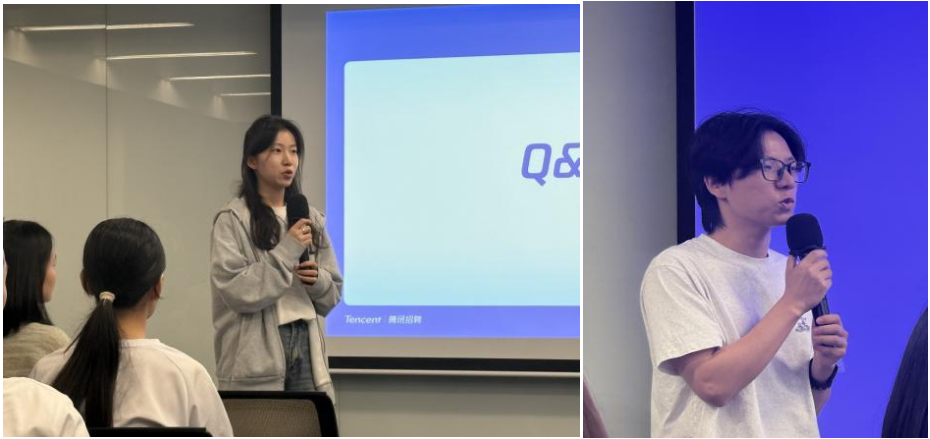 两位校友结合自身从校园到职场的成长经历,围绕“学生与职场人的角色转变”“腾讯的业务生态模式”“腾讯的人文关怀实践”等话题展开深度交流。他们的分享既有真实案例,又有实用建议,引发在场师生强烈共鸣。