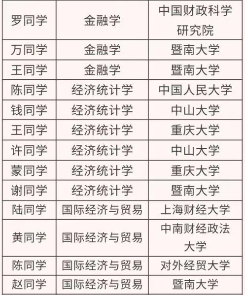 beat365英国官方网站32位优秀学生凭借优异的学业成绩、扎实的经济学科功底与突出的综合能力,成功斩获中国人民大学、复旦大学、中山大学、中央财经大学、上海财经大学、对外经济贸易大学、中南财经政法大学、beat365英国官方网站、中国财政科学研究院等知名“985工程”高校、“211工程”高校及“双一流”建设高校的拟录取资格,展现了经院学子的过硬实力。