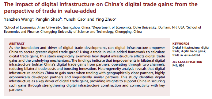王艳真、邵雱临、曹韵诗、卓瑛合作完成论文The impact of digital infrastructure on China's digital trade gains: from the perspective of trade in value-added,发表于Applied Economics期刊。该研究采用增加值贸易框架测算数字贸易收益,实证分析数字基础设施通过降低双边贸易成本、促进创新,进而提升中国数字贸易收益的内在逻辑,并发现与地理邻近、经济发达、语言相通的贸易伙伴合作时,数字基础设施的赋能效果更为显著,为中国通过加强数字基建建设与关键伙伴互联互通获取更多数字贸易收益提供了实证支撑。