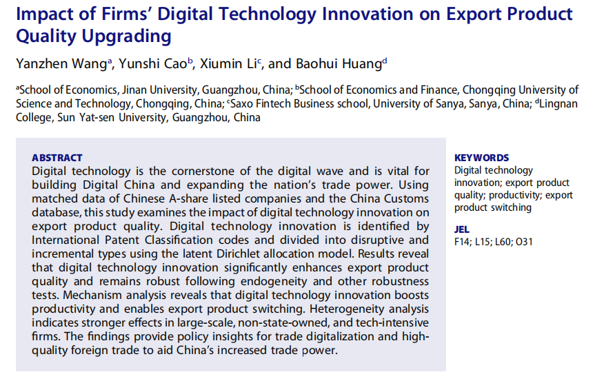 王艳真、曹韵诗、李秀敏、黄保辉合作完成论文Impact of Firms’ Digital Technology Innovation on Export Product Quality Upgrading,发表于Emerging Markets Finance and Trade期刊。该研究依托中国 A 股上市公司与海关数据库匹配数据,将数字技术创新划分为颠覆性与渐进性两类,实证验证了其对出口产品质量升级的显著促进作用,揭示了生产率提升与出口产品转换的核心传导路径,为贸易数字化与外贸高质量发展提供了重要政策启示。
