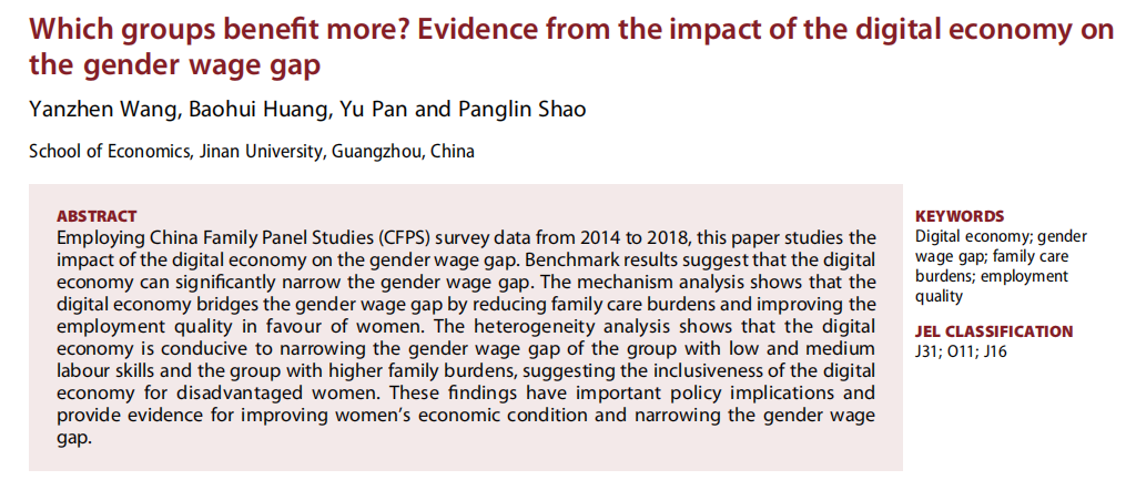 王艳真、黄保辉、潘昱、邵雱临合作完成论文 Which groups benefit more? Evidence from the impact of the digital economy on the gender wage gap,发表于Applied Economics 期刊。该研究基于2014-2018 年中国家庭追踪调查(CFPS)数据,深入剖析数字经济对性别工资差距的影响机制,证实数字经济通过减轻家庭照料负担、提升女性就业质量,显著缩小了性别工资差距,尤其对中低技能、家庭负担较重的女性群体更为利好,凸显了数字经济的包容性价值。