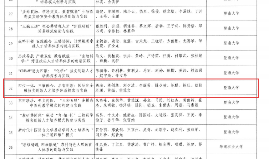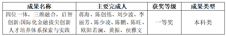 近日,广东省人力资源和社会保障厅、广东省教育厅联合发布《关于表彰全省学校(高等教育)优秀教学成果奖的决定》(粤人社发〔2025〕47 号)。我院蒋海教授团队的教学成果《四位一体,三维融合,启智创新:国际化金融拔尖创新人才培养体系探索与实践》荣获2025年广东省(高等教育)优秀教学成果奖(本科类)一等奖!