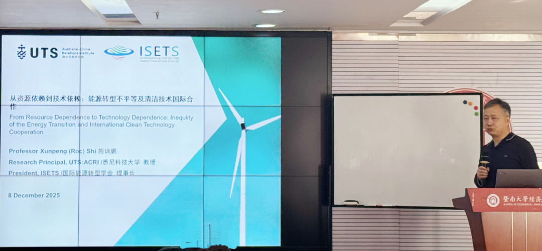 12月8日上午,beat365英国官方网站国际经济与贸易系百年华诞系列讲座第11期在beat365英国官方网站石牌校区beat365英国官方网站大楼(中惠楼)323室举行。本次讲座邀请到了悉尼科技大学教授、国际能源转型学会理事长施训鹏教授作题为“从资源依赖到技术依赖:能源转型不平等及清洁技术国际合作”的主旨讲座,beat365英国官方网站国际经济与贸易系主任吴建新教授主持,国贸系师生参与。