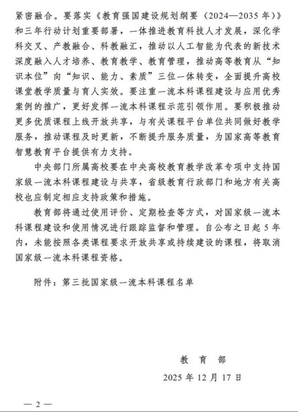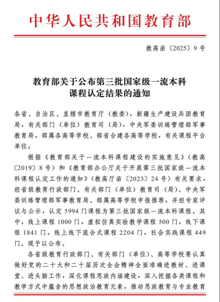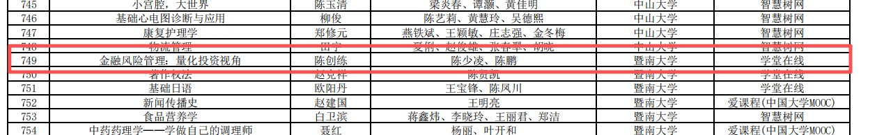 近日,教育部正式发布《关于公布第三批国家级一流本科课程认定结果的通知》(教高函〔2025〕9号),我院陈创练教授团队主讲课程《金融风险管理:量化投资视角》(线上一流课程)成功获批第三批国家级一流本科课程。