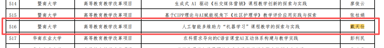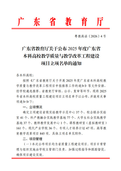 近日,广东省教育厅印发《广东省教育厅关于公布2025年度广东省本科高校教学质量与教学改革工程建设项目立项名单的通知》(粤教高函〔2026〕4号),我院吴建新教授主持的“国际经济学课程群教研室”以及戴天仕副教授主持的《人工智能多维助力“机器学习”课程教学的探索与实践》2个项目获省级立项。